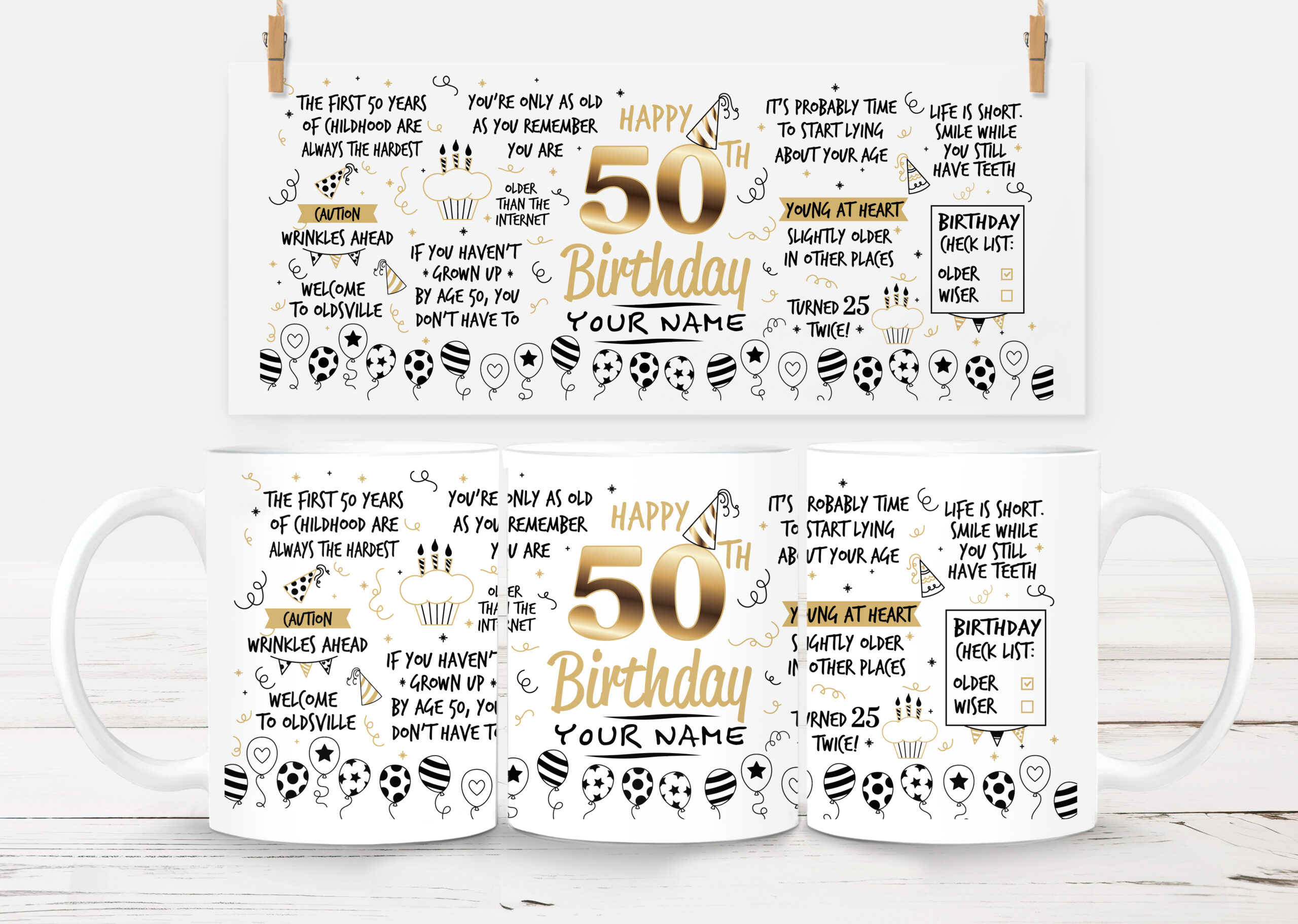 Featuring quotes such as “The first 50 years of childhood are always the hardest”, “Welcome to Oldsville”, “You’re only as old as you remember you are”, “Older than the internet”, and “Turned 25 twice!”, this design brings together everything that makes a fiftieth birthday fun, cheeky and full of personality. The centrepiece reads “Happy 50th Birthday” with a gold-style finish and the option to personalise with your chosen name for a thoughtful and unique touch.