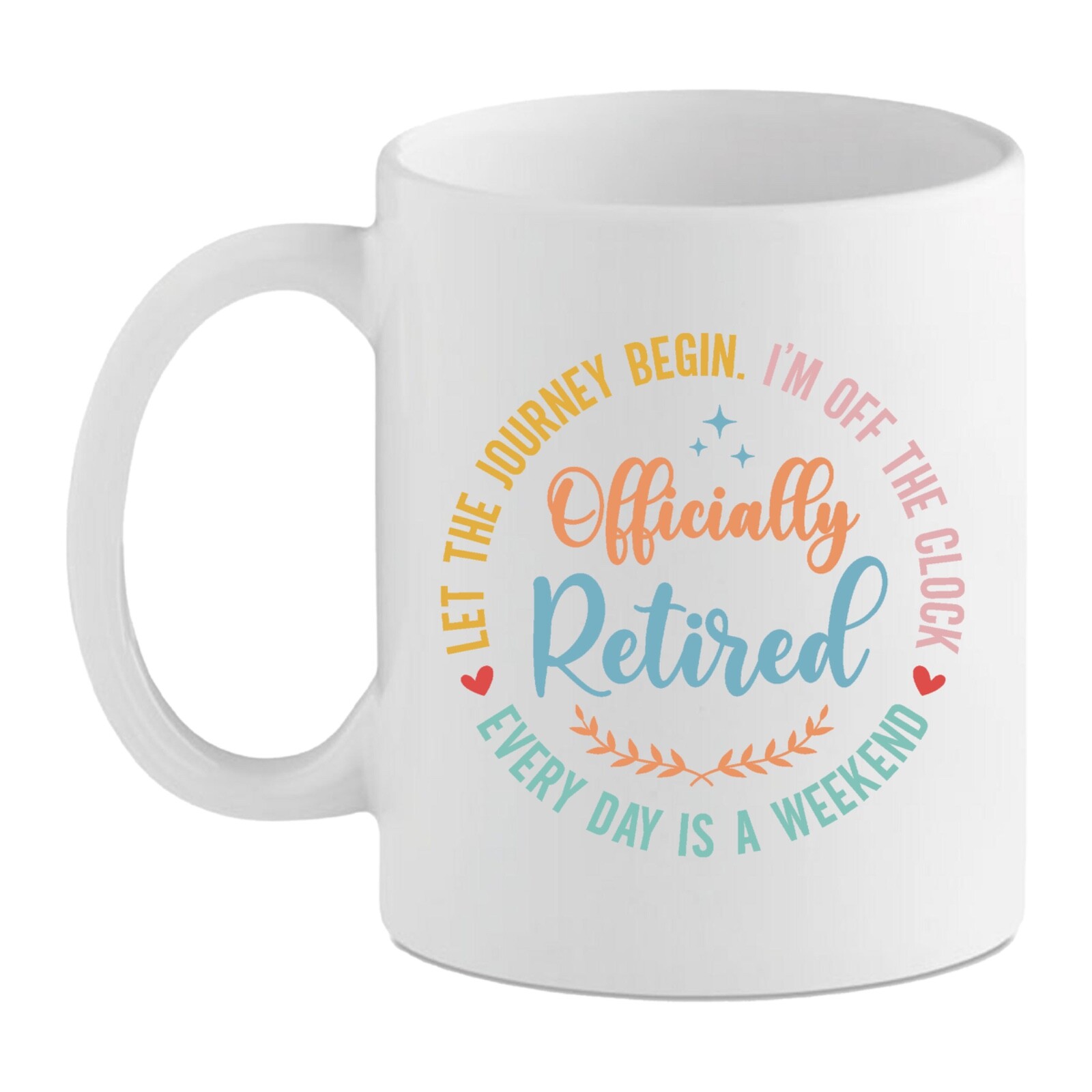 Celebrate a well-earned break from the working world with this cheerful Officially Retired Mug, featuring a pastel circular design with feel-good phrases such as “Let the Journey Begin”, “Every Day Is a Weekend” and “I’m Off the Clock”.